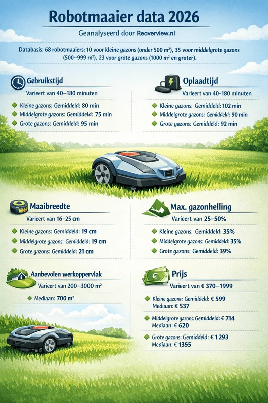 Dit artikel bevat een data-analyse van robotmaaiers, opgesteld op 2 maart 2026. De analyse is gebaseerd op 68 robotmaaiers, die allemaal op de Nederlandse markt verkrijgbaar waren op het moment dat de analyse werd opgesteld.