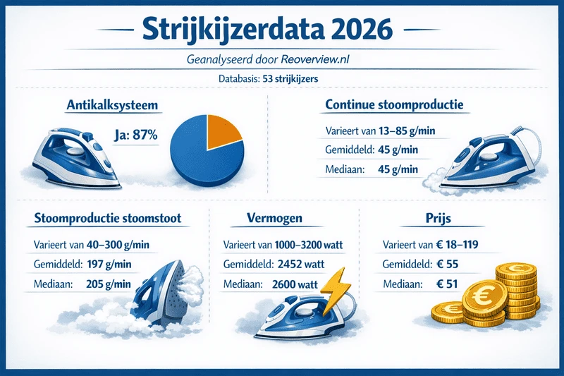 Dit artikel bevat een data-analyse voor strijkijzers, opgesteld op 25 februari 2026. De analyse is gebaseerd op 53 strijkijzers, die allemaal op de Nederlandse markt verkrijgbaar waren op de dag dat de analyse is opgesteld. De analyse is verdeeld over 48 stoomstrijkijzers en 5 droogstrijkijzers.